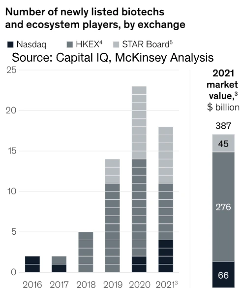 When it comes to doing business in China, the first thing to keep in mind is “China Speed”.  As far as China’s biopharma industry is concerned, growth is rapid and exponential.  One study, conducted by McKinsey, shows that the market value of China’s newly publicly listed biopharma innovation players skyrocketed from $3 billion in 2016 to more than $380 billion in July 2021. The second main factor to keep in mind is “China Scale”. During 2018 and 2020, China’s biopharma market accounted for seven of the world’s ten largest biopharma IPOs.